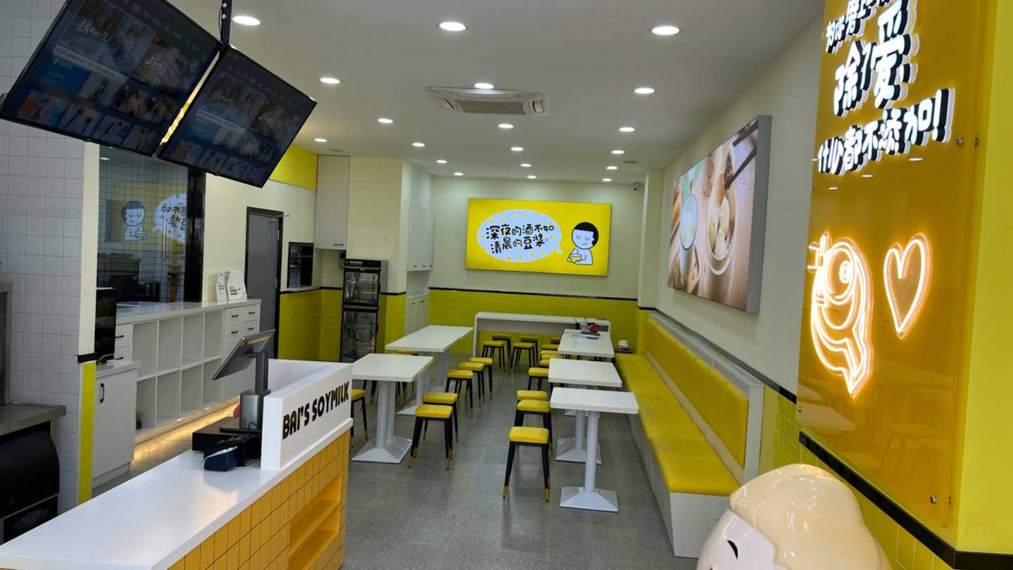 漿小白于2023年成功將店鋪迭代至2.5版本,創新推出“外賣+堂食+外帶”多元化經營模式。漿小白2.5門店在軟硬件設施上實現全面升級,整體設計風格明亮、溫馨且充滿時尚感,特別是那醒目的明黃配色,彰顯了品牌的活力與魅力。